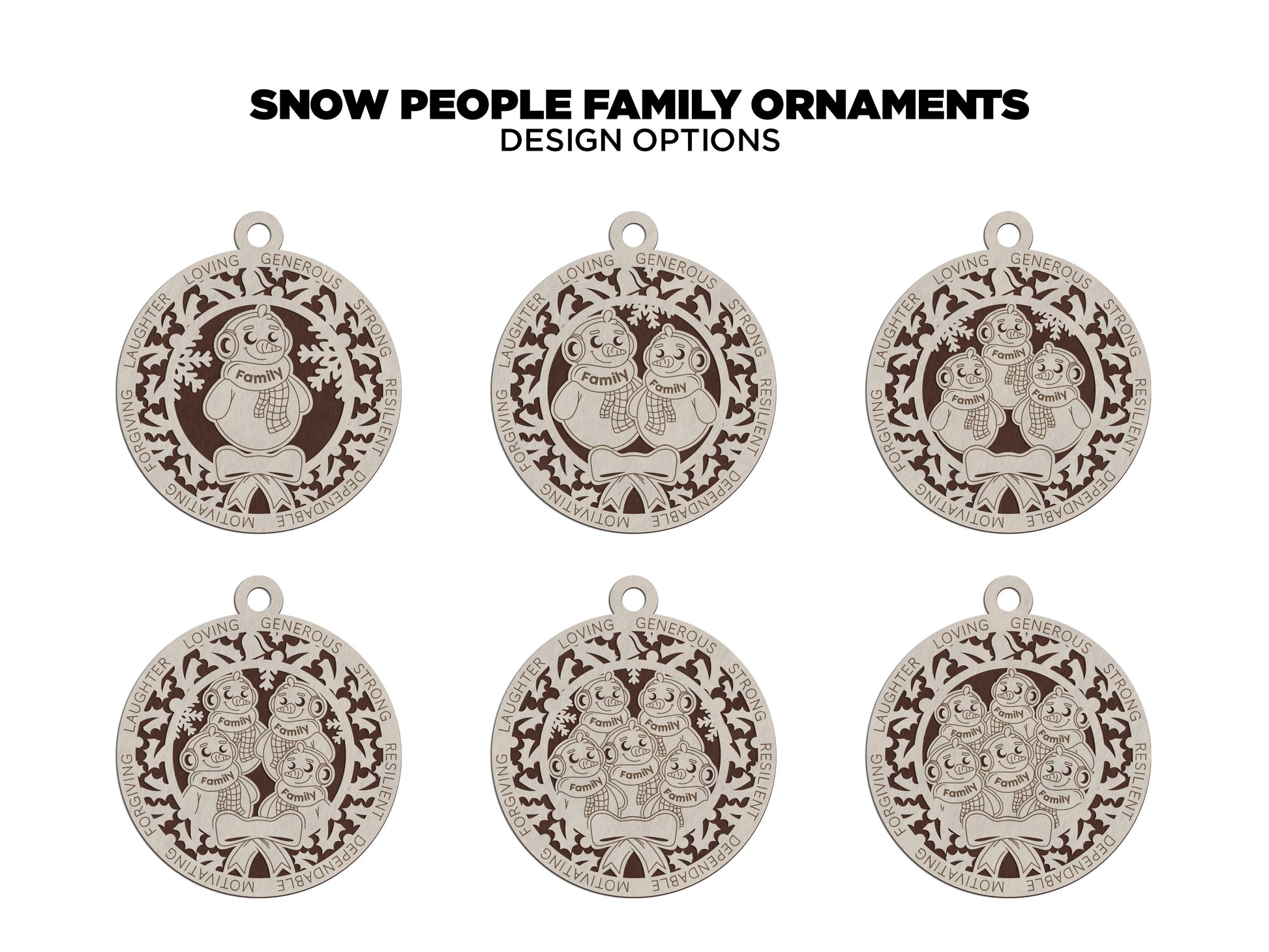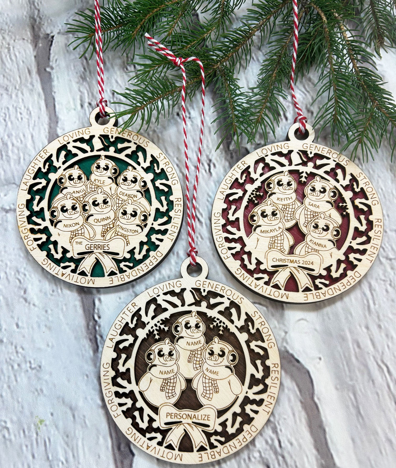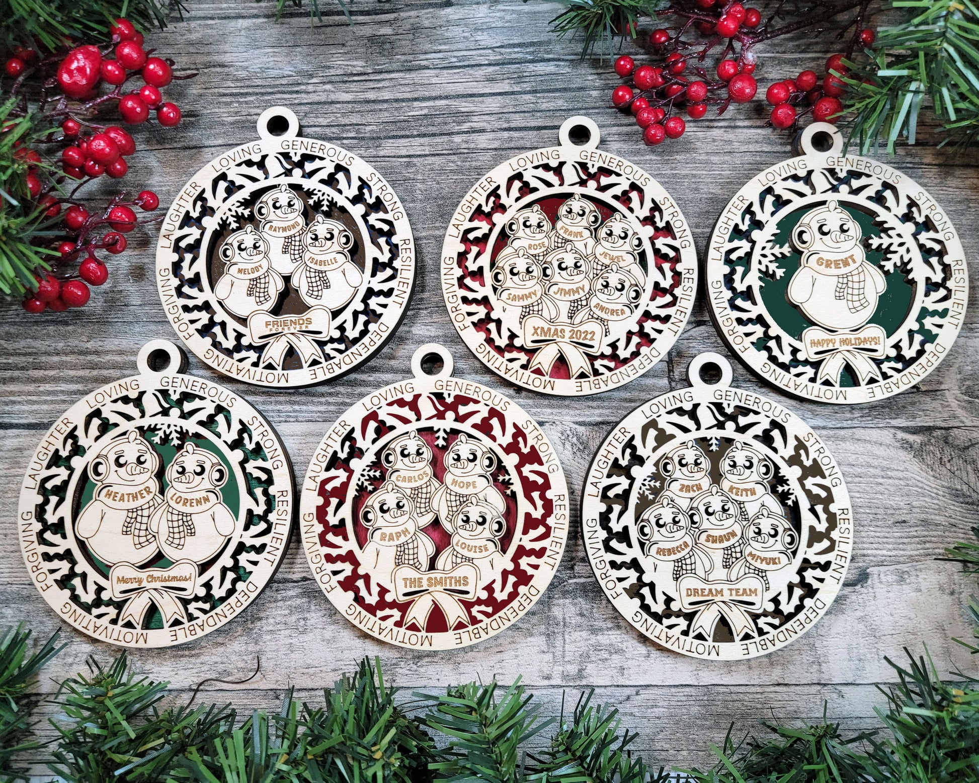 These Snow family ornaments can be customized with your family members first name, last name or special message. There are 3 background colours to choose from and you have the ability to add up to 6 family members. These ornaments make a great keepsake that can be enjoyed every holiday season.