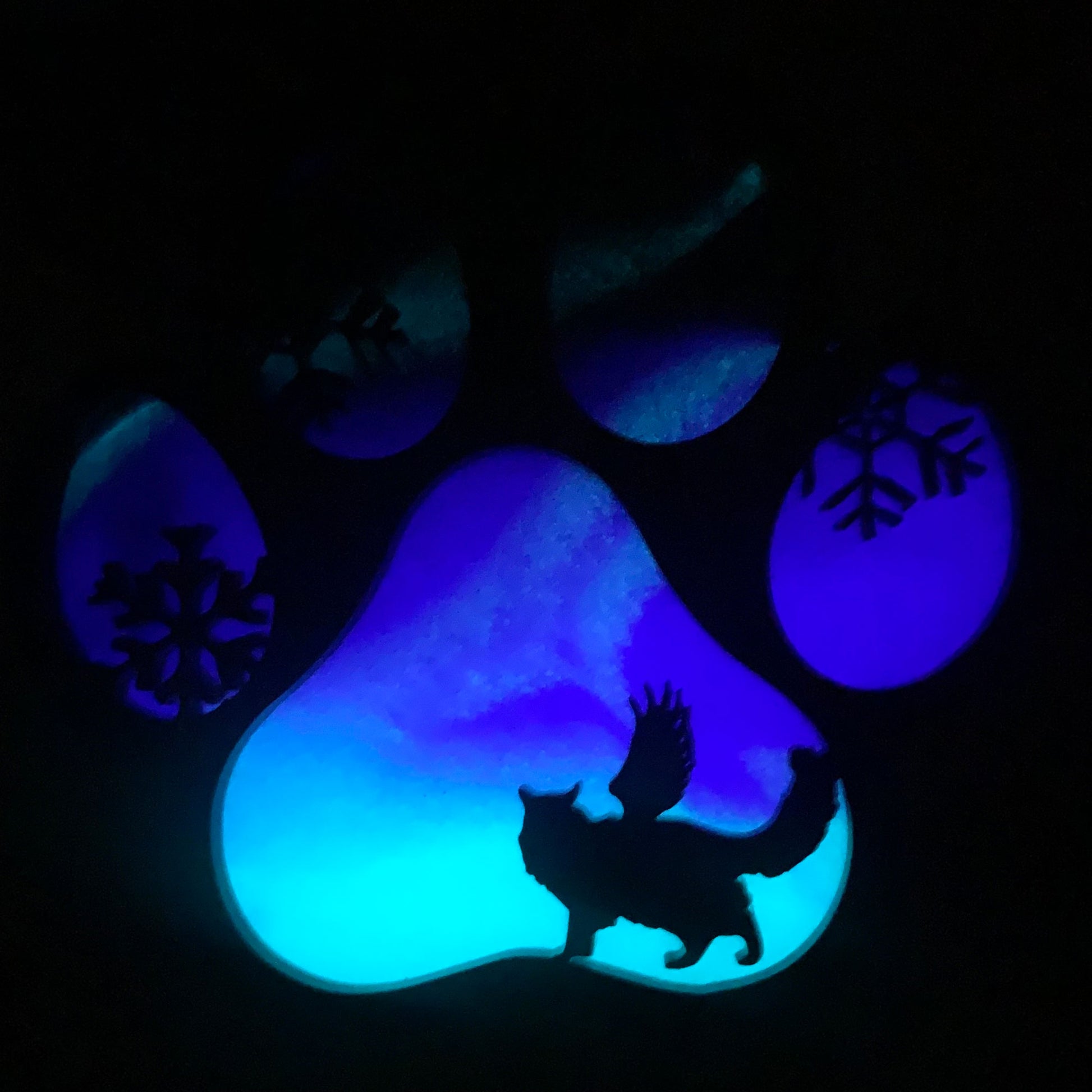 Cat lovers these glow-in-the-dark cat paw Christmas ornaments are for you! Done in my classic Northern Lights resin art style then layered with a silhouette of your feline friend they are the perfect addition to your Christmas tree.